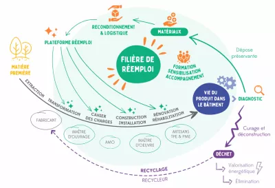 La structuration du réemploi ne peut se faire qu'en partenariat avec l'écosystème professionnel que sont les réseaux et les fédérations, qu'ils soient spécifiques ou plus généralistes sur l'économie circulaire, voire le bâtiment durable. Les structurations autour des entreprises du bâtiment sont des acteurs également incontournables : sur la qualification, la dépose, le reconditionnement et principalement sur l'acceptation et la responsabilité pour la pose des matériaux.